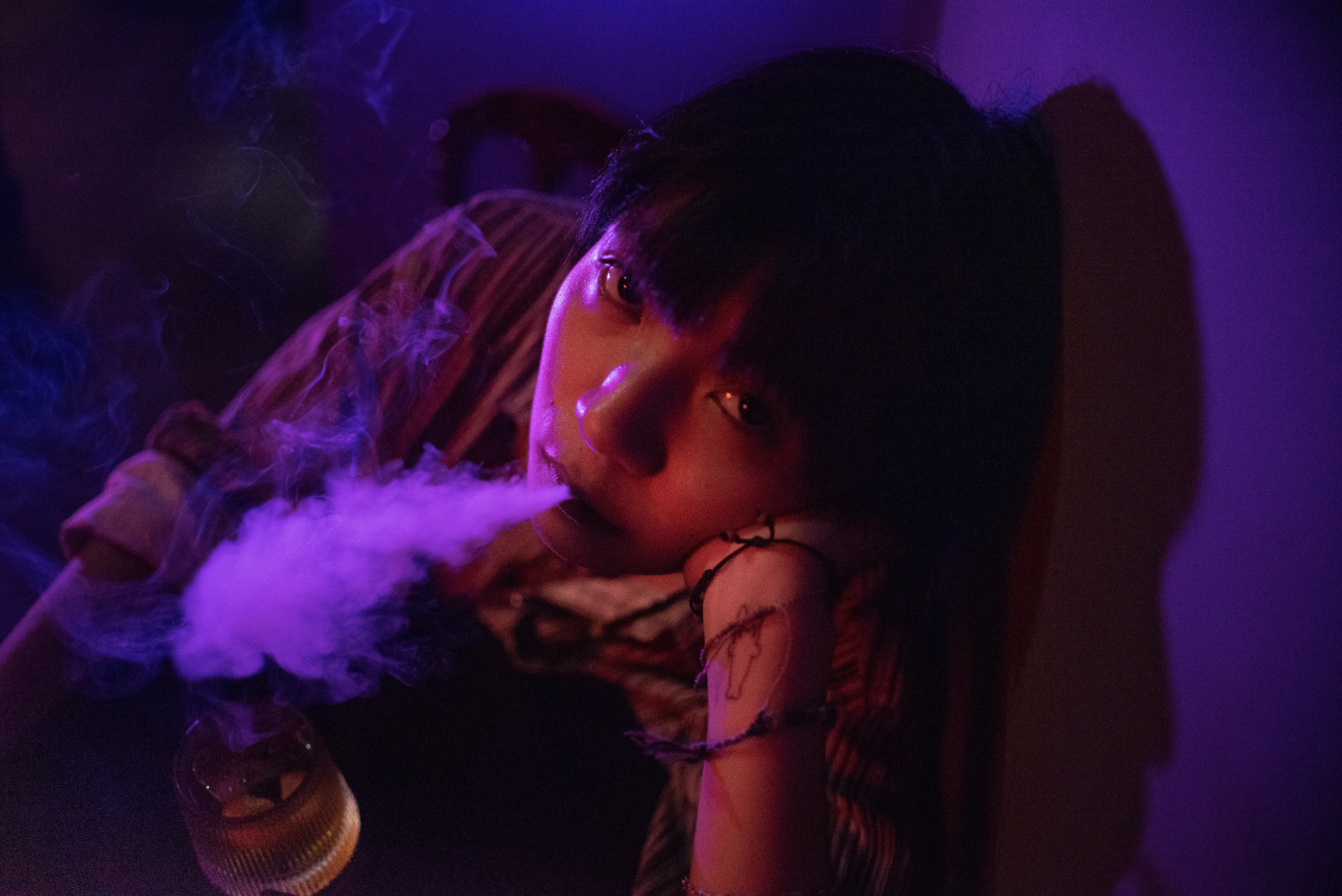 A thick cloud of smoke obscures a patron's face in the intimate purple glow of a hidden bar. As the city's rigid daytime hierarchies dissolve, this nocturnal exhale represents a vital release, a desperate shedding of professional masks to find, and be found by, authentic company.